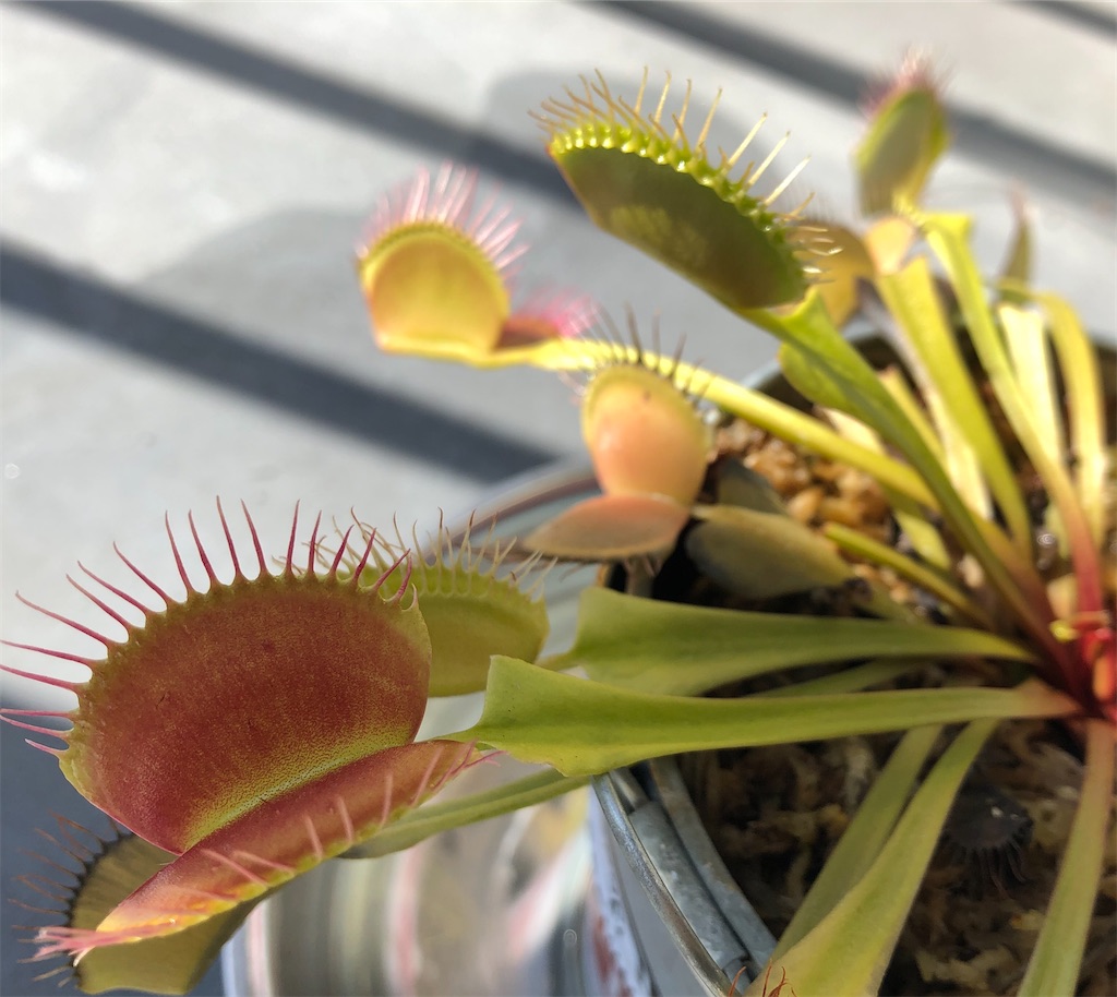 英語ではハエトリソウをVenus Flytrapというそうです。葉が女神のまつ毛みたいということらしいですよ😇優雅な名前ですね。こちら、まつ毛も赤くなりました。いつの間にマスカラ塗ったんでしょうか(笑)